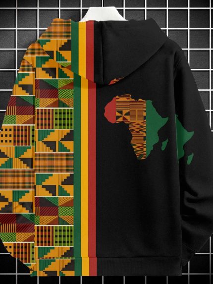 African Heritage Map Pattern Mens heavyweight fleece lined hoodie Men’s sheavyweight hoodie Zipper Sweatshirt High quality Durable African Egypt Print Casual Fashion Autumn Winter Trend Mens Fleece Hooded Suitable for Leisure Outdoor Sports