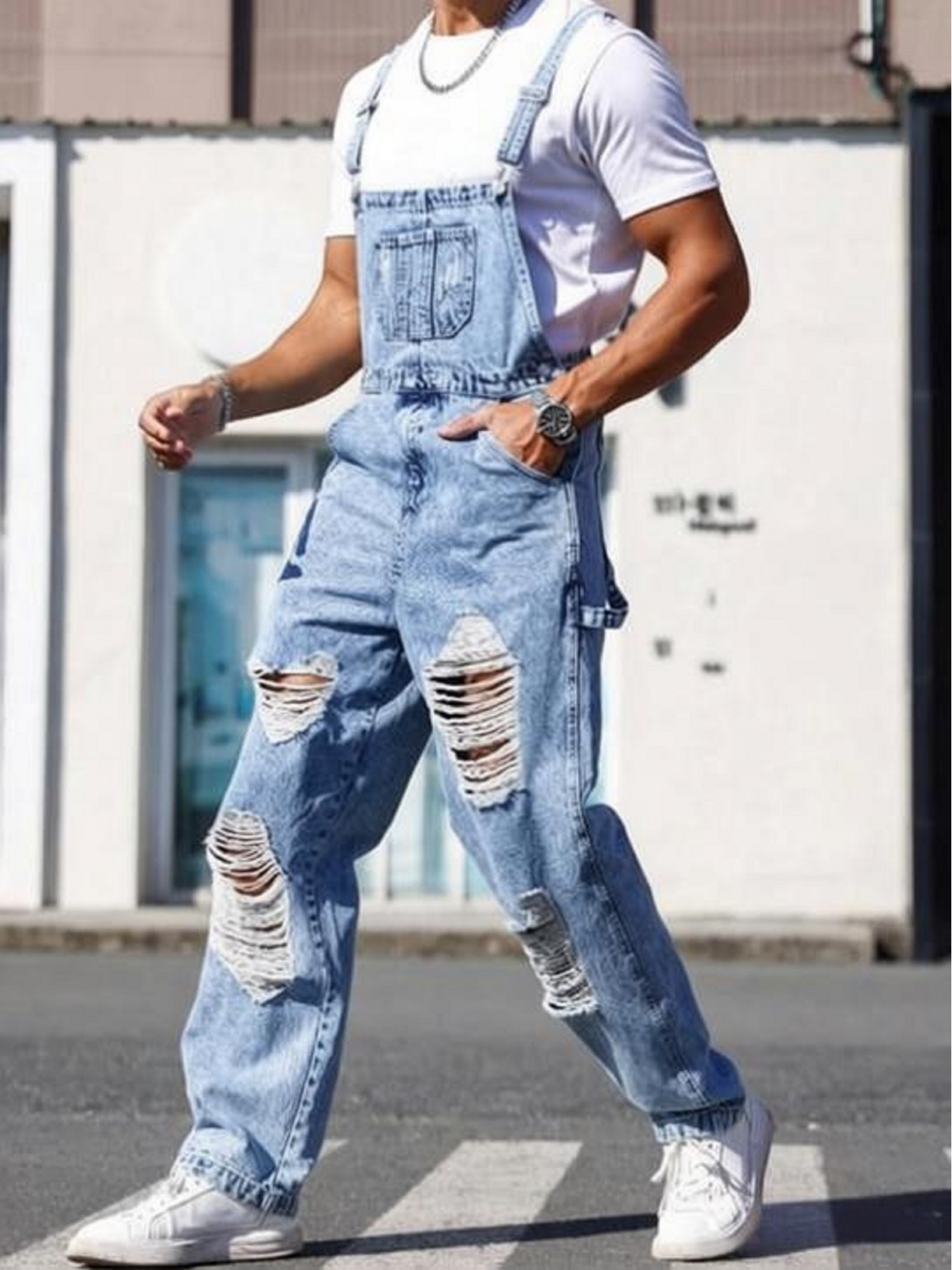 1pc Men’S Street Trendy Retro Workwear Style Overalls | Retro Minimalist Distressed Slim Fit Small Leg Denim Pants with Adjustable Shoulder Strap Design, Suitable for All Seasons, Easy to Match – Blue