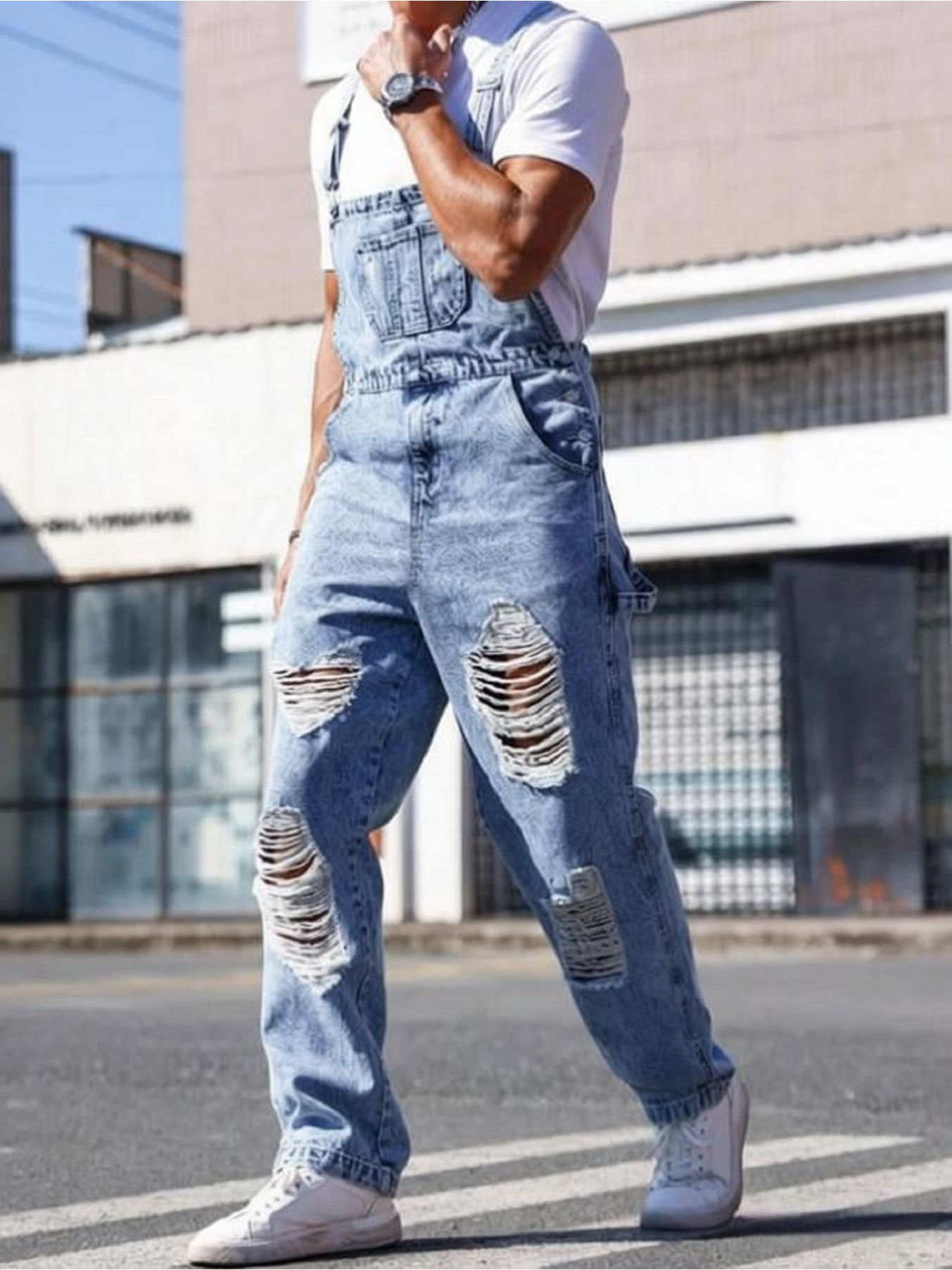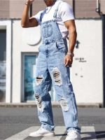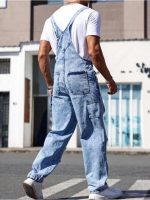 1pc Men’S Street Trendy Retro Workwear Style Overalls | Retro Minimalist Distressed Slim Fit Small Leg Denim Pants with Adjustable Shoulder Strap Design, Suitable for All Seasons, Easy to Match – Blue