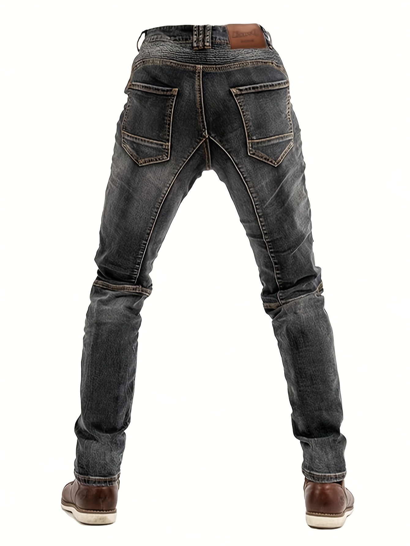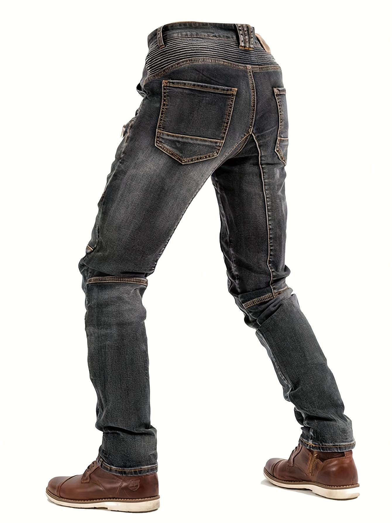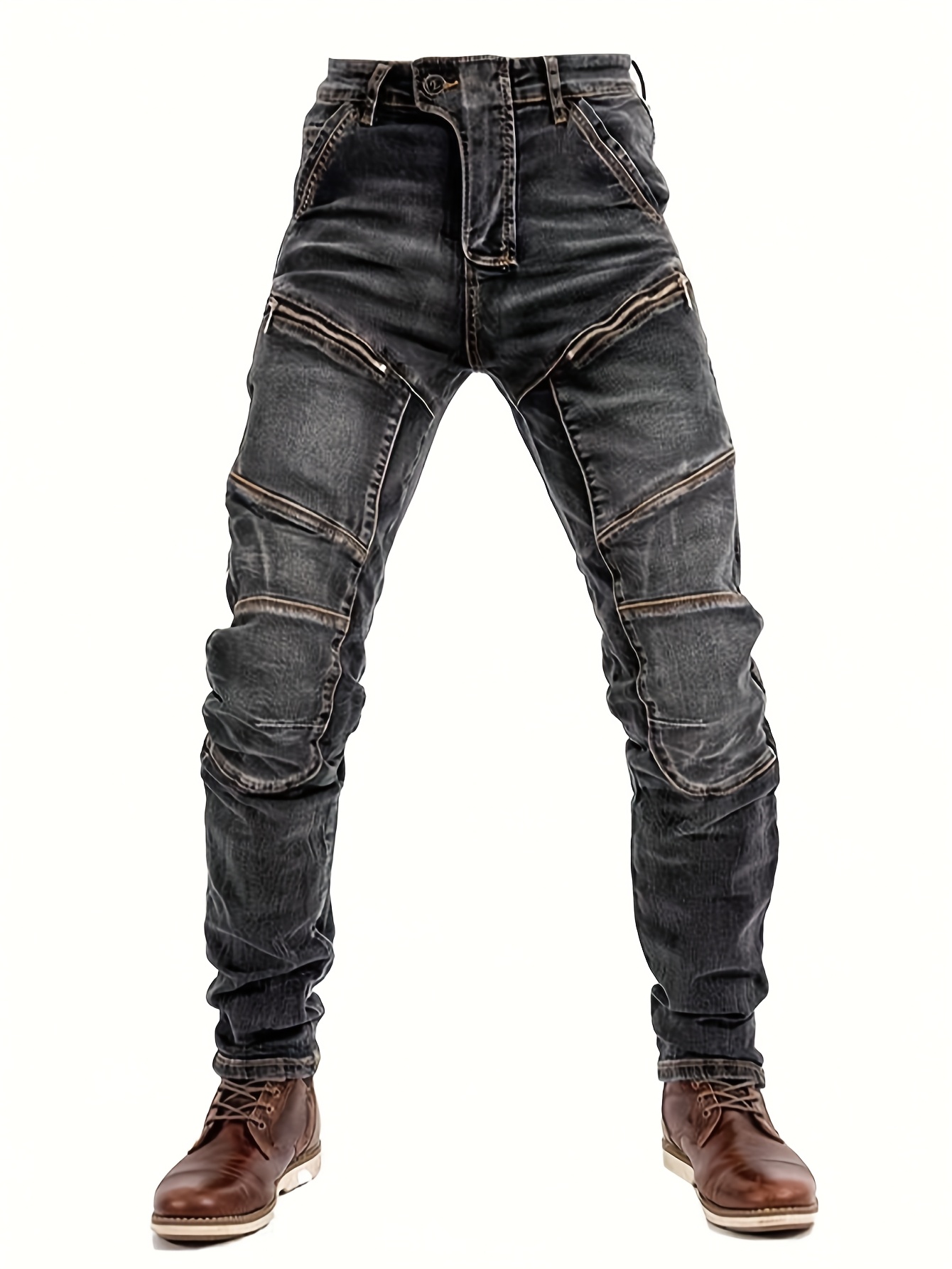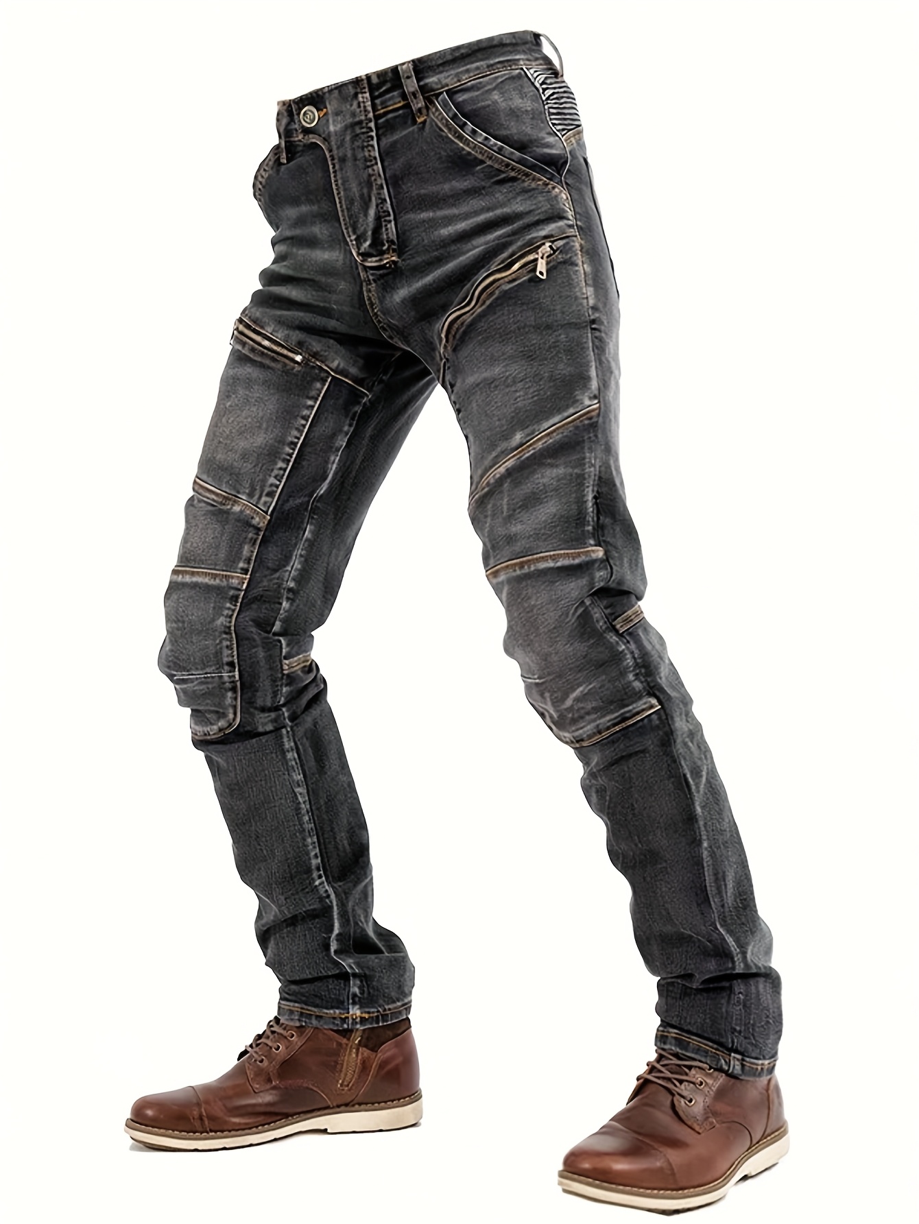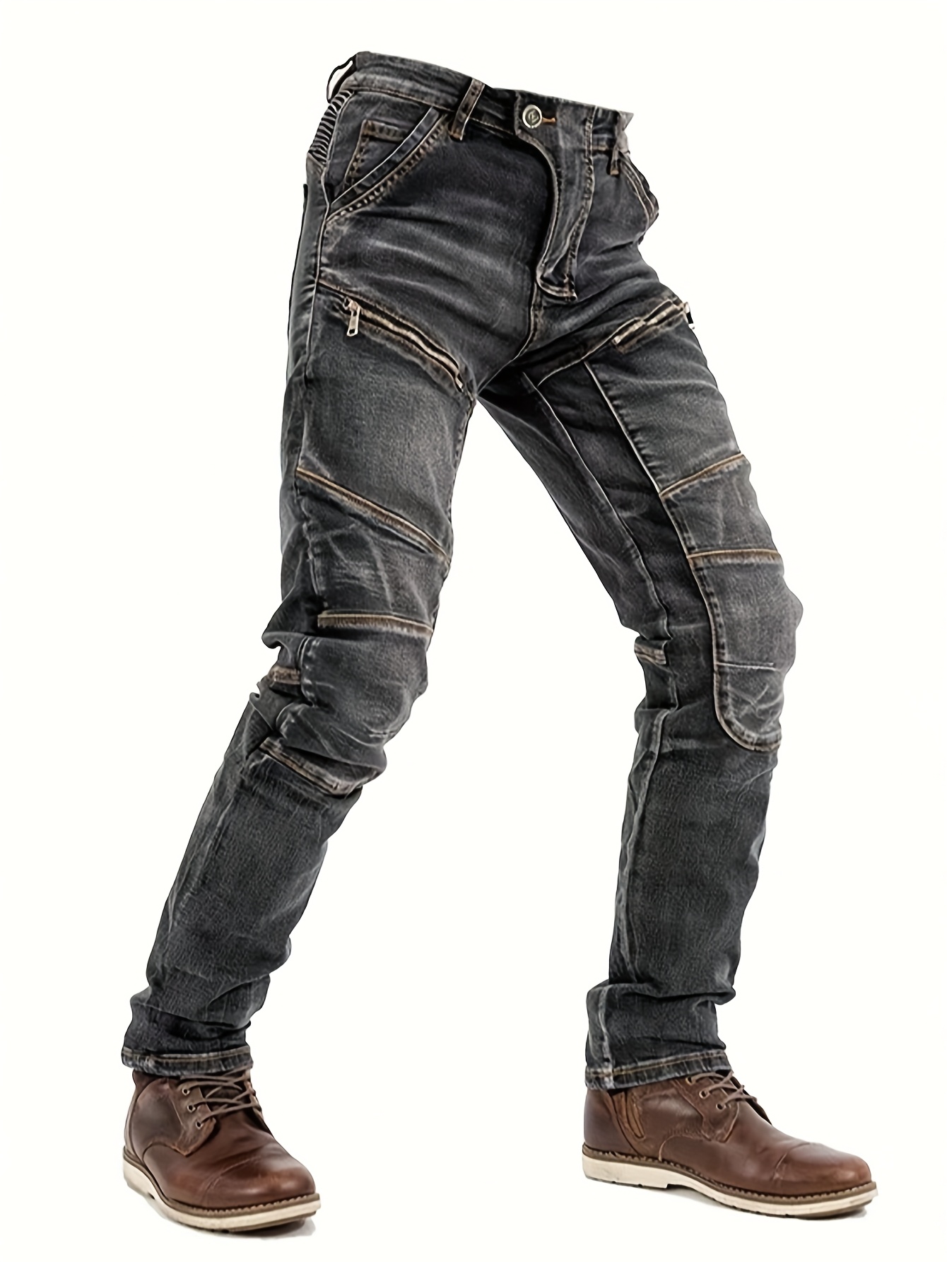 Men’s Stretch Slim-Fit Vintage Washed Denim Motorcycle Pants with Zippered Pockets – Mid-Stretch All-Season Comfort, Machine Washable Straight-Leg Design for Casual & Riding, Comfortable Yearround Wear | Durable Fabric