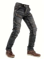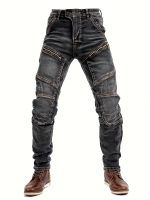 Home Men's Jeans Men’s Stretch Slim-Fit Vintage Washed Denim Motorcycle Pants with Zippered Pockets – Mid-Stretch All-Season Comfort, Machine Washable Straight-Leg Design for Casual & Riding, Comfortable Yearround Wear | Durable Fabric