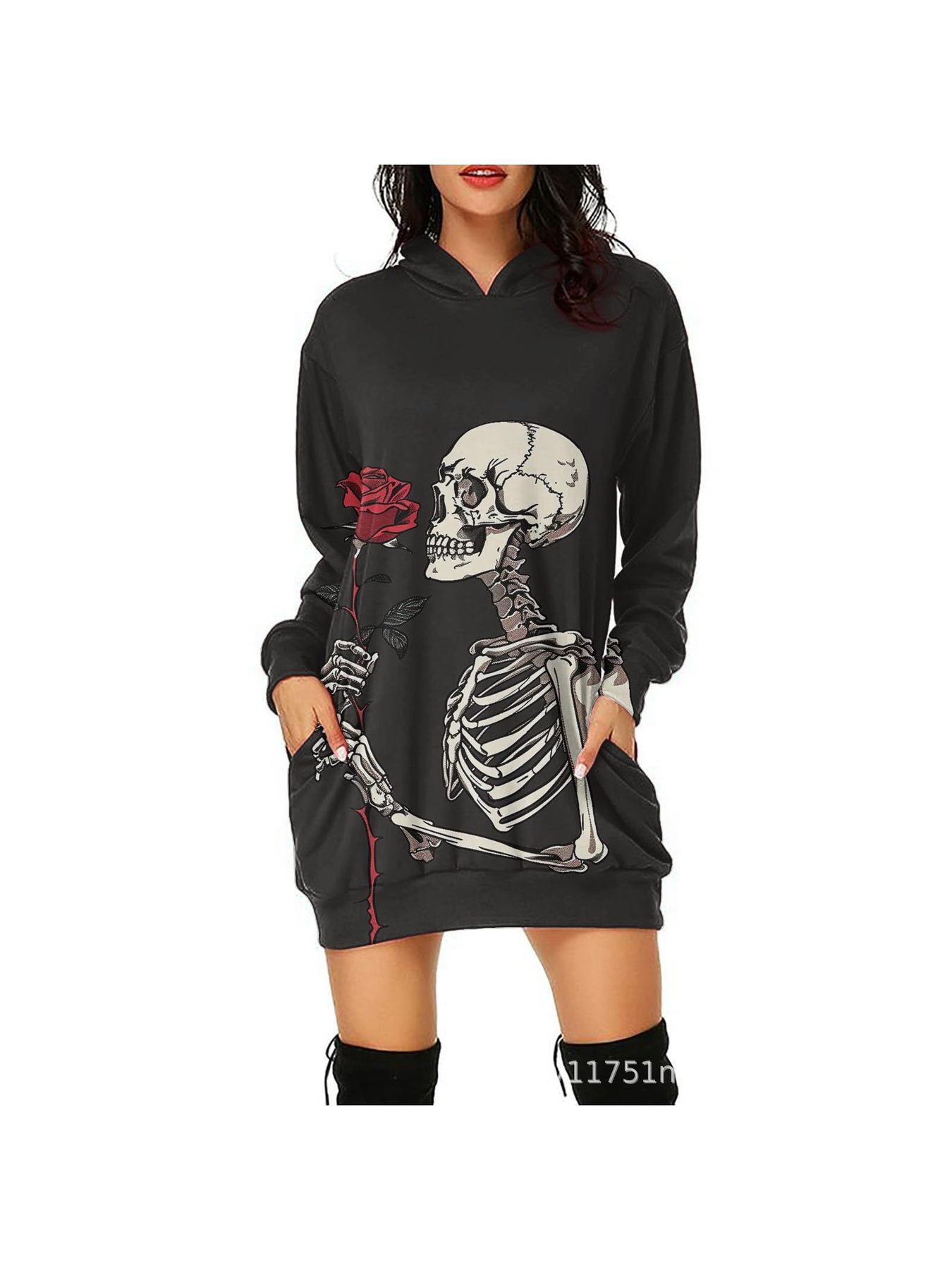 Plus Size, Halloween Long Sleeve Sweatshirt Dress 3D Beautiful Skeleton Pattern Printing LYQWYDMA012