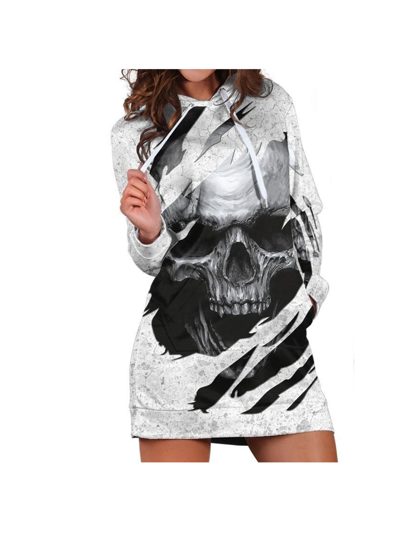 Plus Size – Halloween Skull Print Sweatshirt Dress | Loose Fashion Long Sleeve Women’S Mid-Length Hooded Pullover with Medium Stretch Fabric