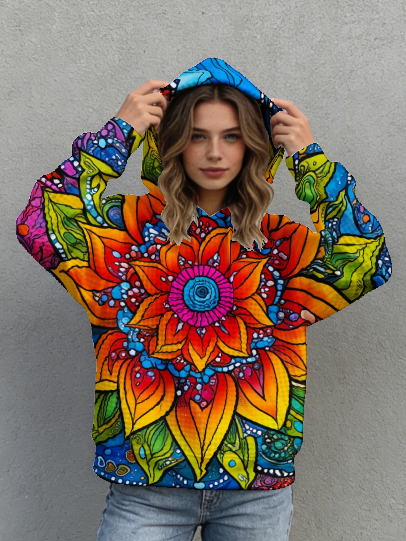 Plus Size – Plus Size – Colorful Waffle Hoodie with Vibrant Mandala Flower Print | Casual Wear and Festival Style, Oversized Fit, Long Sleeve, No, All-Season