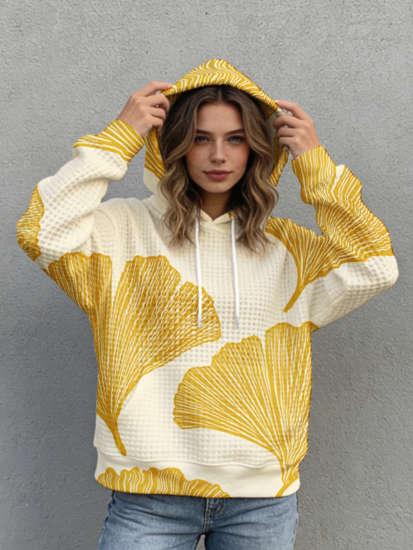 Plus Size – Plus Size – Waffle Hoodie Cream Yellow Ginkgo Leaf Print | Casual Women’S Autumn Winter Streetwear Fashion Sweatshirt with Drawstring Hood, Long Sleeve Pullover Top