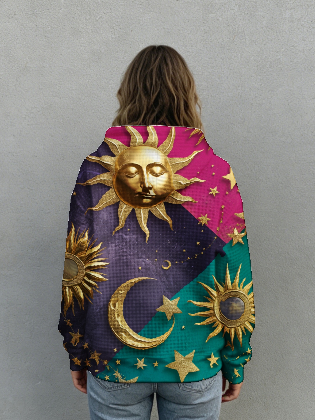 Plus Size – Plus Size – Waffle Hoodie | Purple and Teal with Golden Moon and Stars Print, Oversized Fit, Long Sleeve, No, Elegant Style for Casual Wear, Sizes 0XL-5XL