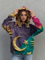 Home Curve Sweatshirt Plus Size – Plus Size – Waffle Hoodie | Purple and Teal with Golden Moon and Stars Print, Oversized Fit, Long Sleeve, No, Elegant Style for Casual Wear, Sizes 0XL-5XL