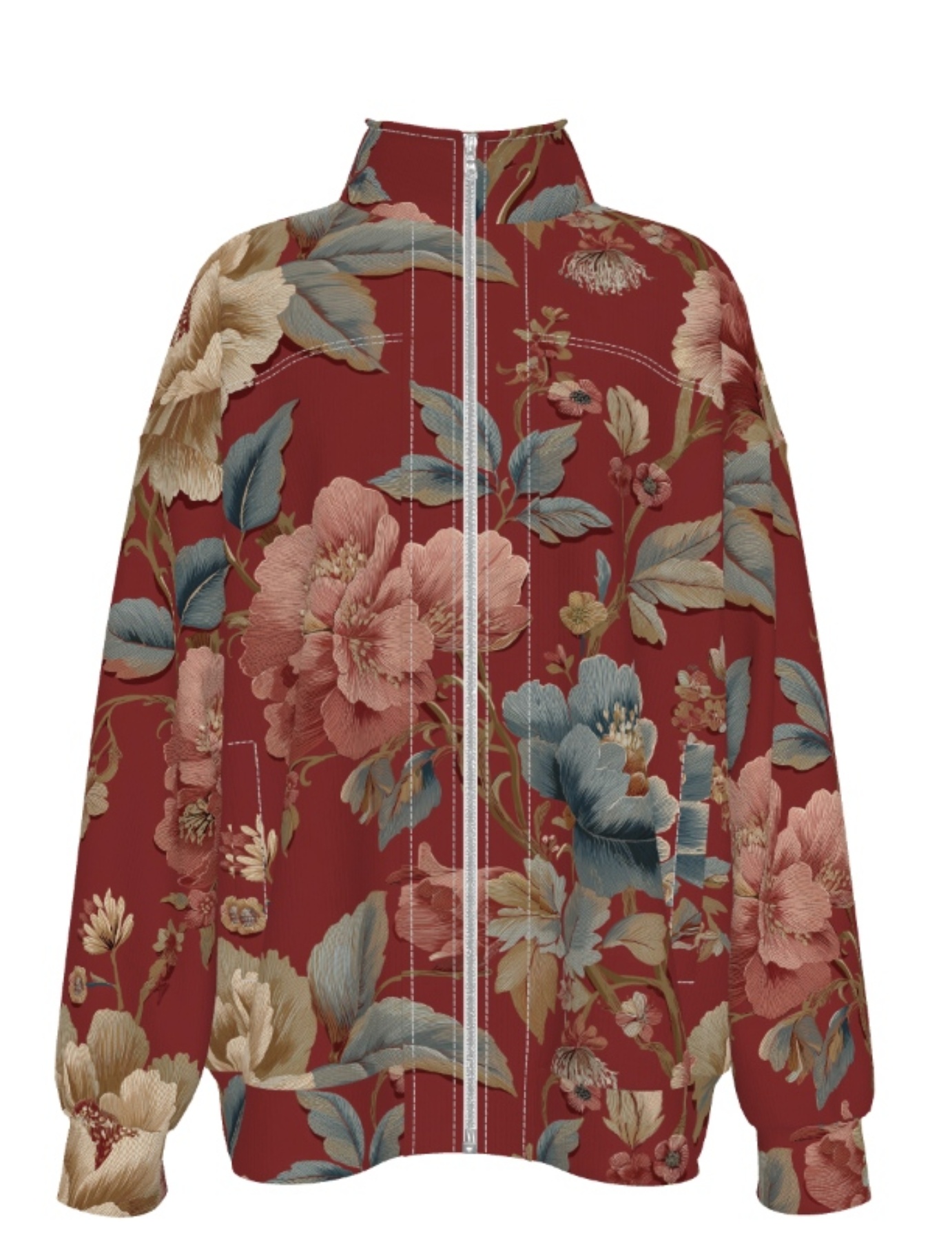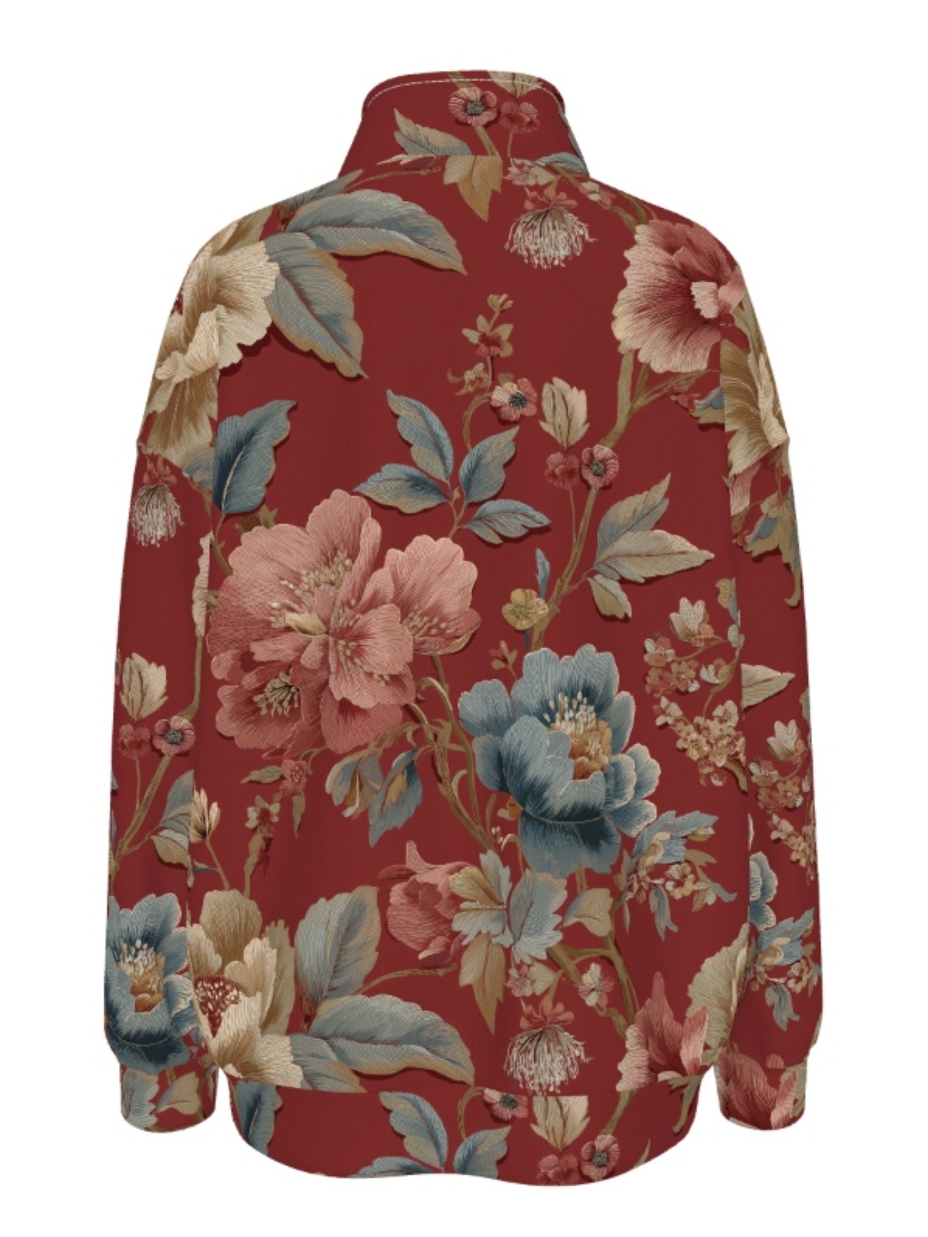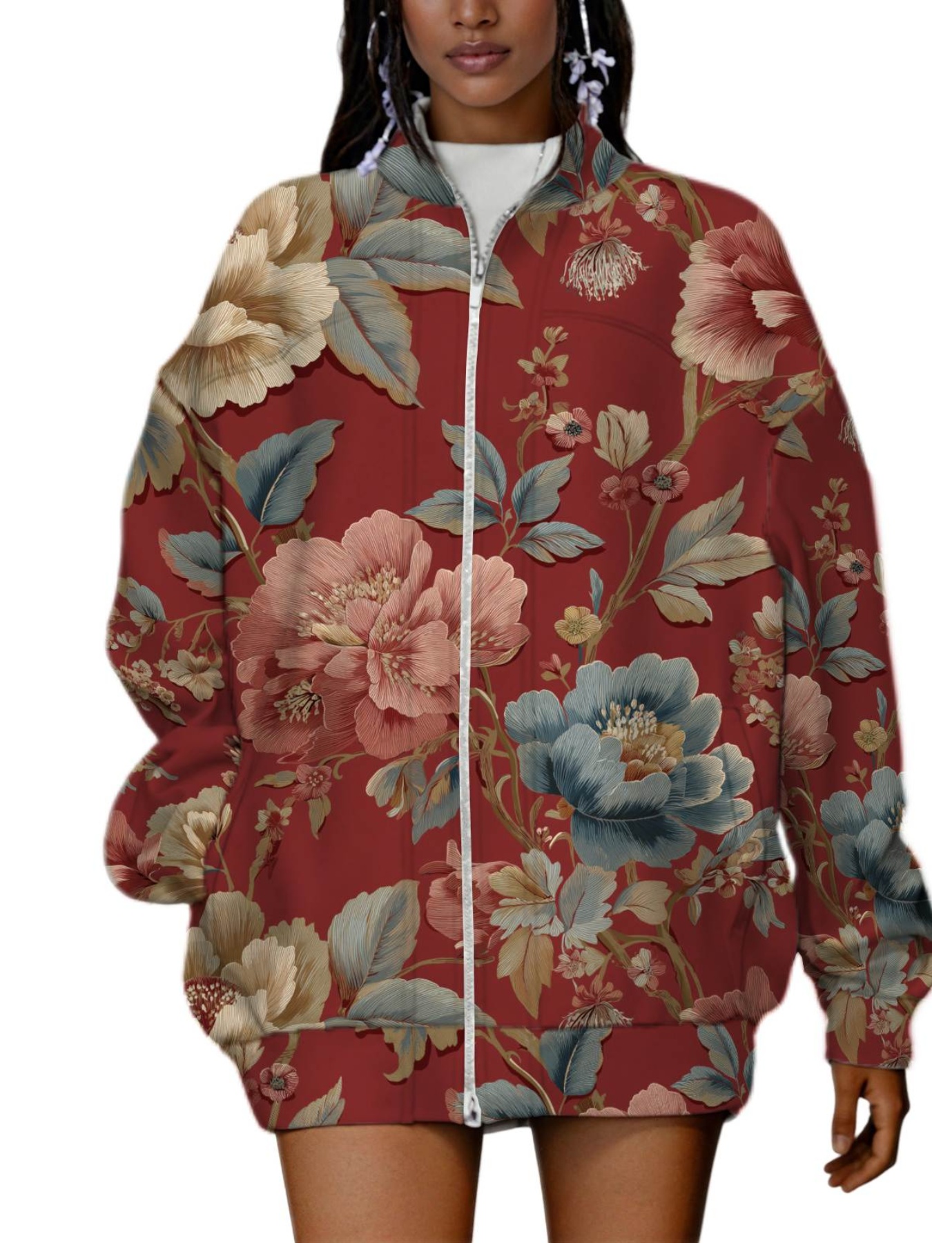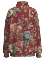 Plus Size – Plus-Size Women’S Floral All-Over Print Zip-Up Sweatshirt – Loose Fit Stand Collar Long Sleeve Casual Top, Machine Washable Autumn Winter Pullover for Casual Attire, Autumn Apparel, Comfortable Pullover, Seasonal Fashion, Trendy Top, Durable Construction, Pullover Top, Fashion Lovers