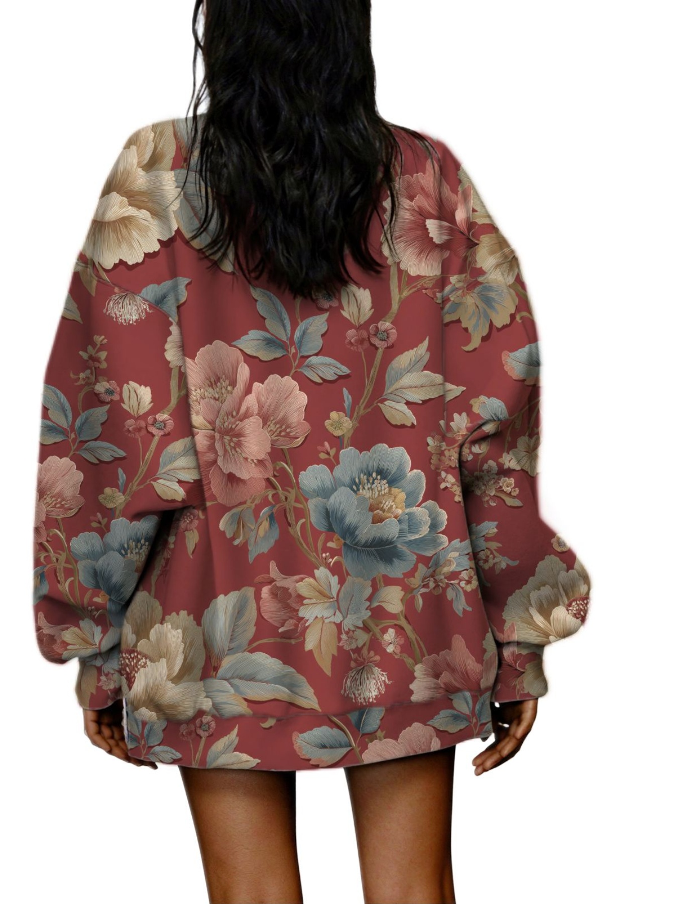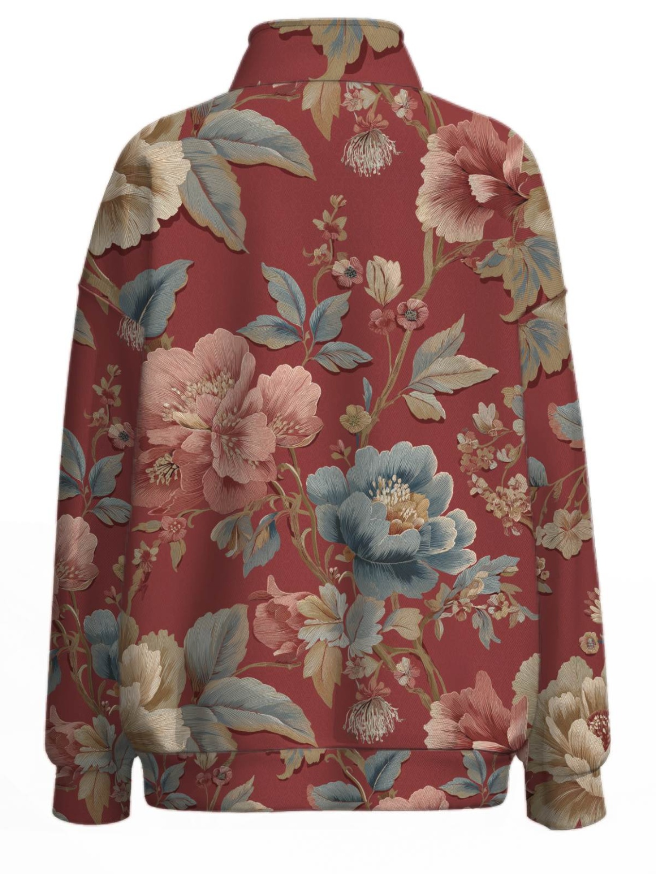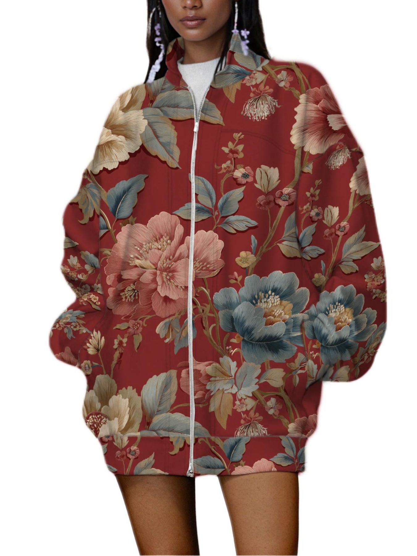 Home Curve Sweatshirt Plus Size – Plus-Size Women’S Floral All-Over Print Zip-Up Sweatshirt – Loose Fit Stand Collar Long Sleeve Casual Top, Machine Washable Autumn Winter Pullover for Casual Attire, Autumn Apparel, Comfortable Pullover, Seasonal Fashion, Trendy Top, Durable Construction, Pullover Top, Fashion Lovers
