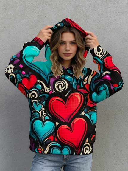 Plus Size, Men’ & Women’ Oversized Waffle Hoodie – Full-Body Colorful Heart & Swirl Print Hooded, Size 0XL-5XL, Machine Washable Streetwear Suitable for, Year-Round Wear (No u002FHardware)