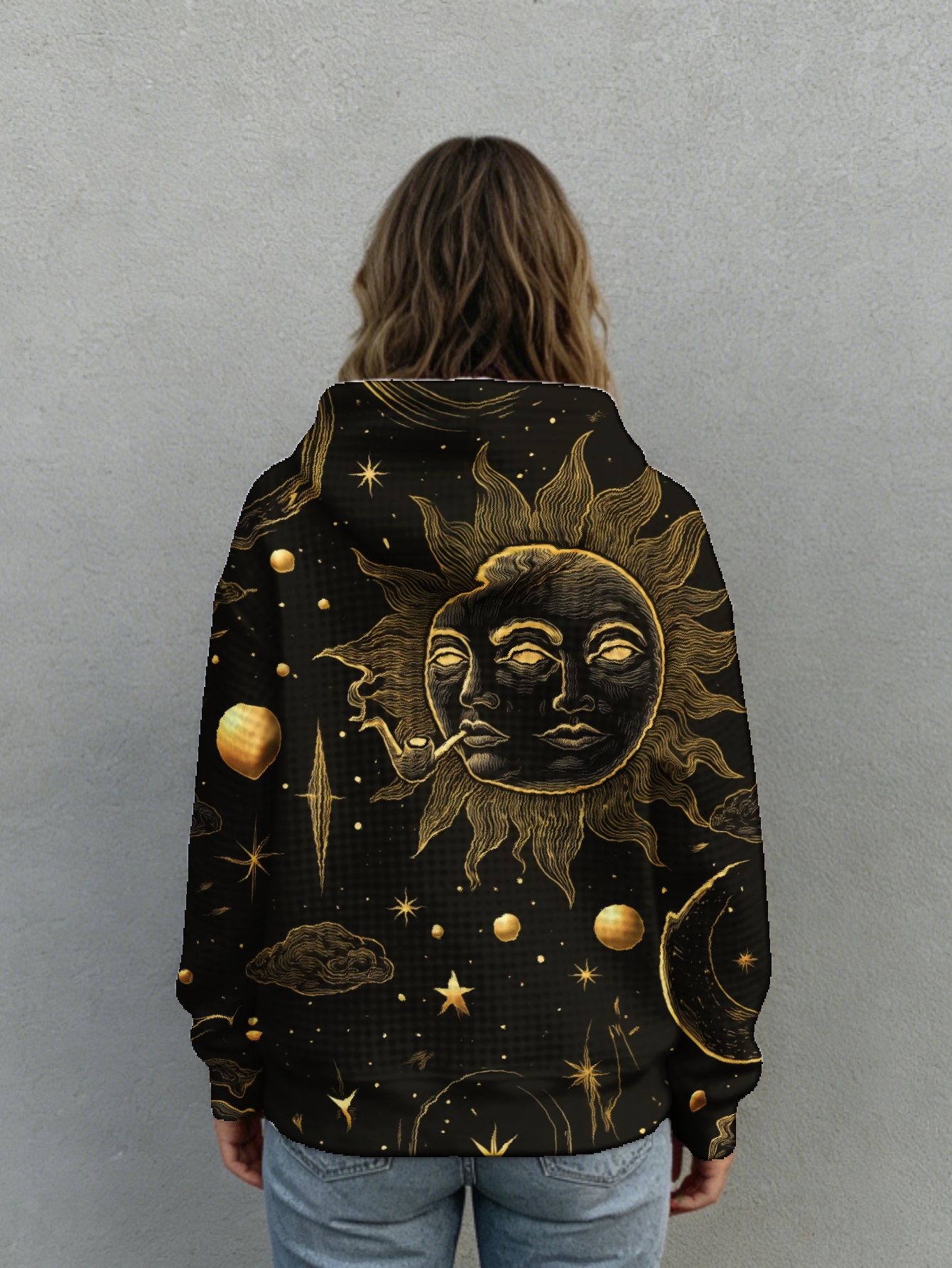 Home Curve Sweatshirt Plus Size, Waffle Hoodie Black Hoodie with Golden Cosmic Sun And Moon Print for Casual Wear 0XL-5XL