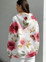 Plus Size, Waffle Hoodie with Zipper Floral Print Hooded Zipper Sweatshirt White Rose And Leaf Pattern Casual Outfit for Women Daily Wear And Leisure 0XL-5XL
