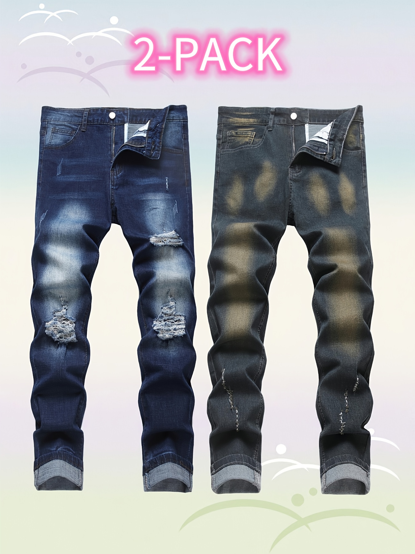 Home Men's Jeans Set of 2 Men’S Vintage Ripped Stretch Jeans, Stylish Casual Straight-Leg Long Pants.