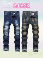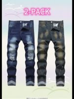 Set of 2 Men’S Vintage Ripped Stretch Jeans, Stylish Casual Straight-Leg Long Pants.