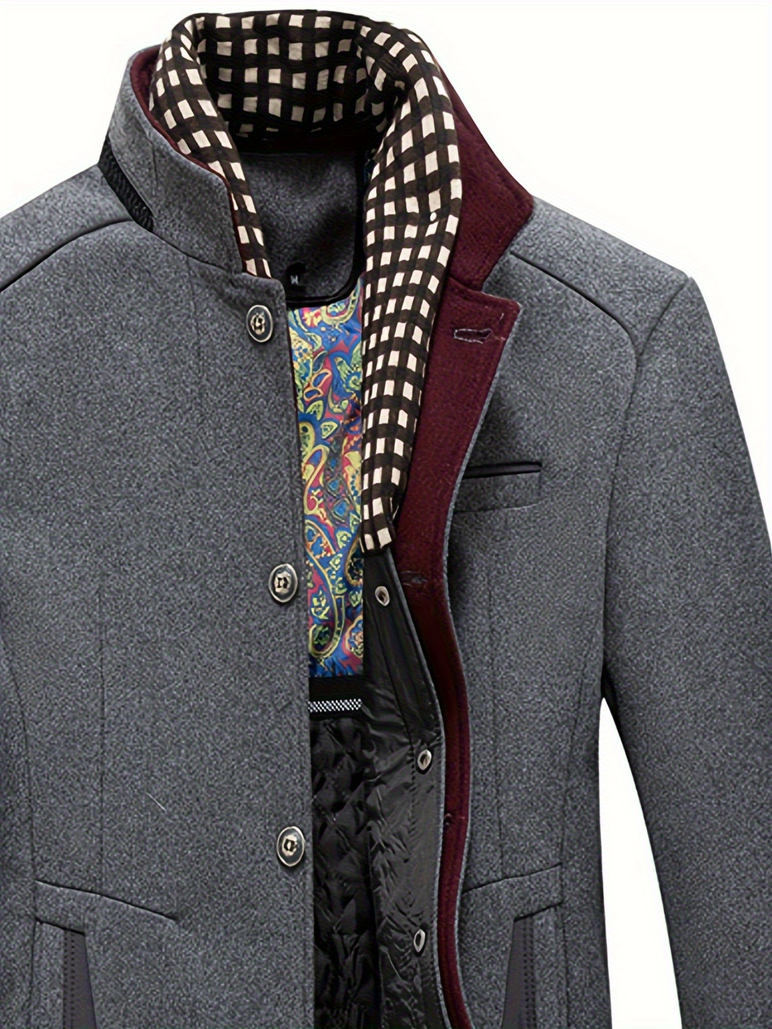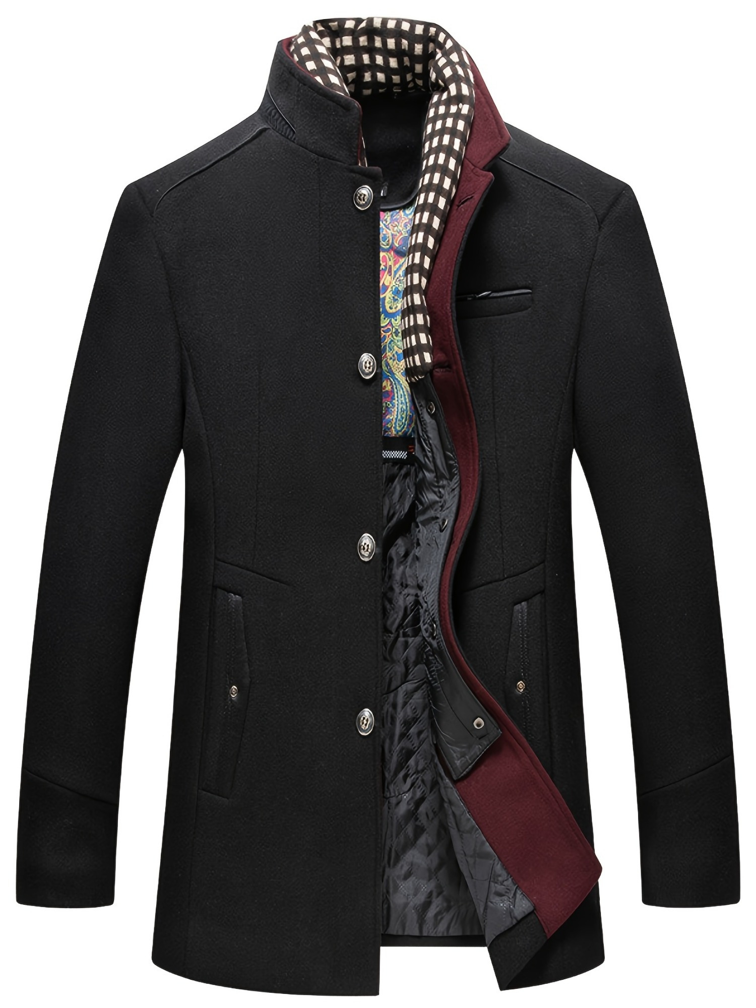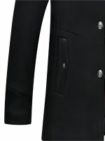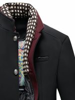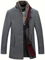 Sophisticated Men’S Raincoat Featuring Scarf Accents – Resistant to Wind, Cozy, Fashionable, Ideal for Winter Work Settings, Available in Black with Purple And Grey Highlights, Equipped with Side Pockets, Button Fastening, And in Larger Sizes