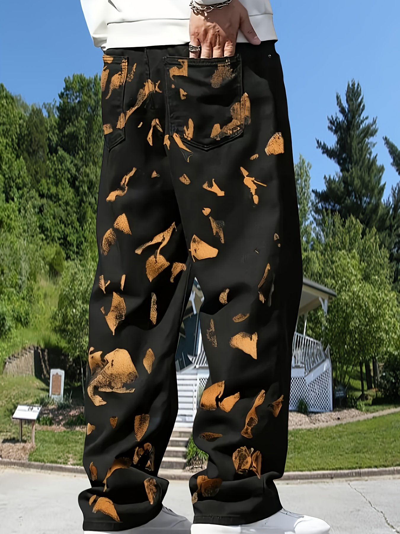Home Men's Jeans Stylish Black Wide-Leg Print Stonewashed Jeans for Men | Casual Loose Straight Elastic Pants, New Fashion Trendy Four-Season Jeans, Medium Stretch Fabric, Washed Detail