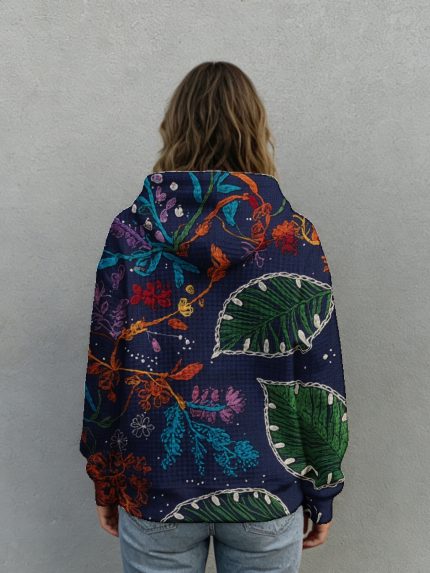 Plus Size – Plus Size – Waffle Hoodie | Navy Blue Tropical Floral and Leaf Pattern, Oversized Fit, Long Sleeve, No, Elegant Style for Casual Wear and Outdoor, Sizes 0XL-5XL