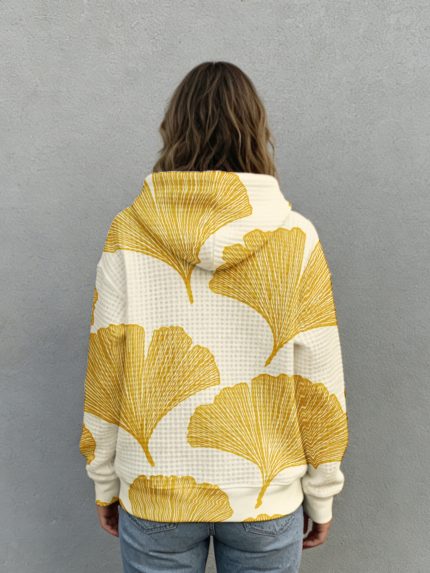 Plus Size – Plus Size – Waffle Hoodie Cream Yellow Ginkgo Leaf Print | Casual Women’S Autumn Winter Streetwear Fashion Sweatshirt with Drawstring Hood, Long Sleeve Pullover Top